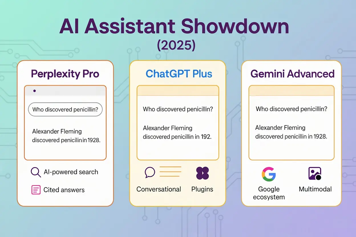 AI assistants are no longer novelties — they’re productivity engines. The three leaders in 2025 are Perplexity Pro, ChatGPT Plus, and Gemini Advanced. Each brings a different approach: search-driven, conversation-driven, and ecosystem-driven. Here’s how they compare.