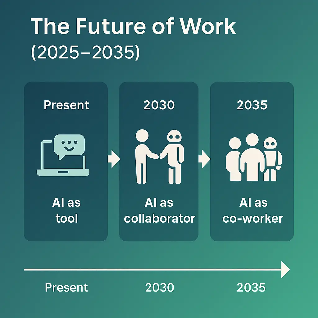 Artificial intelligence is no longer just a productivity tool — it’s reshaping how, where, and why we work. The decade ahead will see humans and AI co-create new workflows, professions, and even economic models.